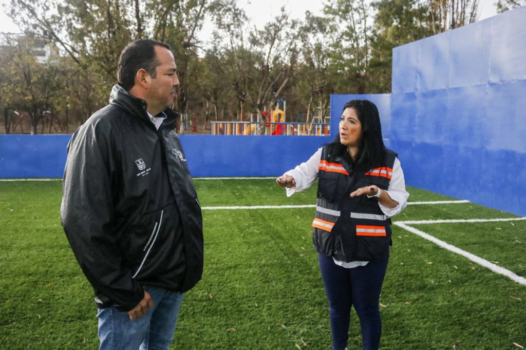 El presidente municipal de San Juan del Río, Roberto Cabrera Valencia, en equipo con la secretaria de Obras Publicas Municipales, Edith Álvarez Flores, supervisó las obras de rehabilitación de la cancha de futbol rápido en la Unidad Deportiva Maquío y del pavimento de la calle Benito Juárez en el Barrio del Espíritu Santo.