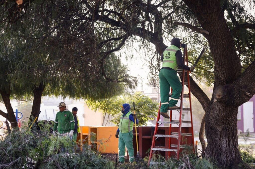 De acuerdo con el titular de la Secretaría de Servicios Públicos Municipales, Ernesto Mora Rico, en Haciendas San Juan se llevaron a cabo trabajos de poda de árboles, deshierbe de áreas verdes, recolección de ramas y pasto, además de aplicación de pintura sobre grafiti, rehabilitación de alumbrado público con reparación de luminarias y acciones de limpieza general a través del barrido fino.