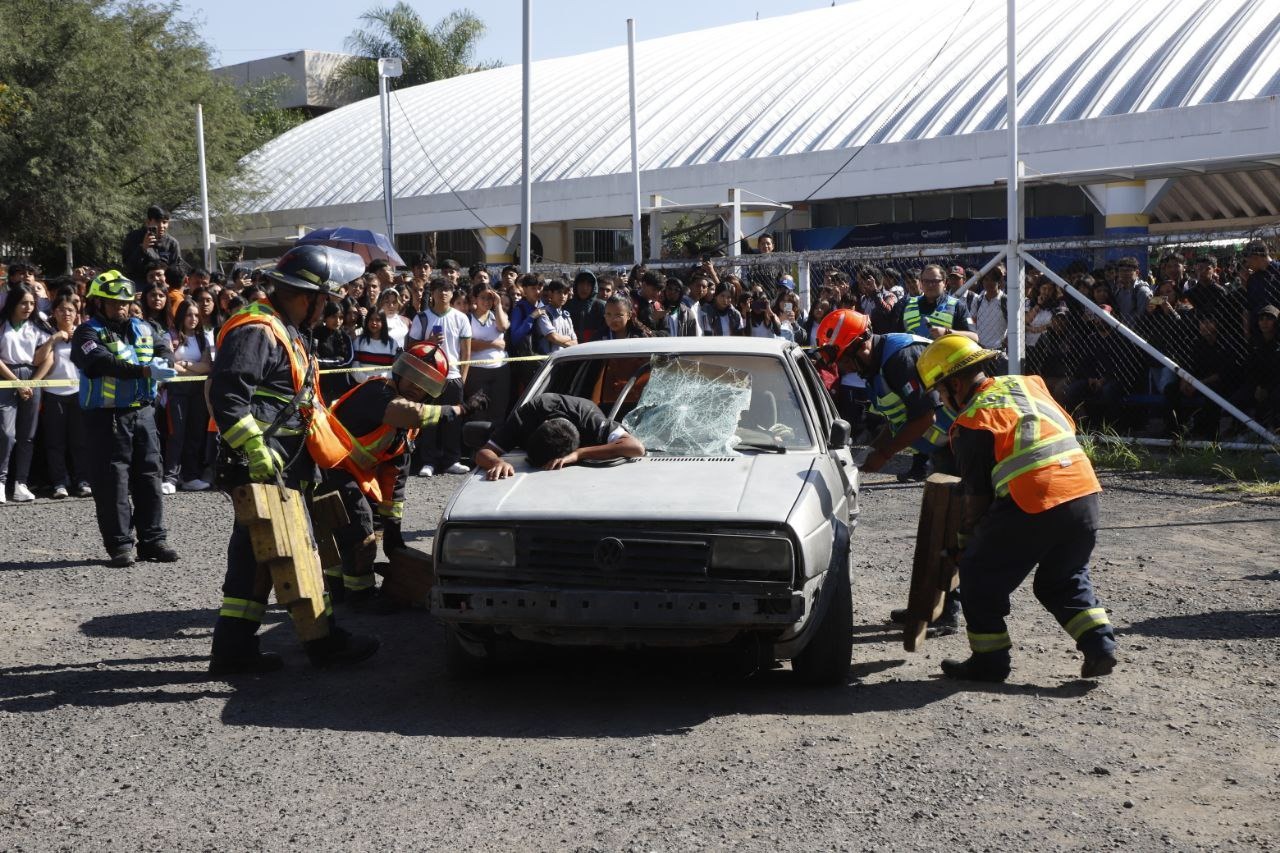 Alumnas y alumnos del Centro de Estudios Científicos y Tecnológicos del Estado de Querétaro, (CECyTEQ) Plantel 5 de Cerrito Colorado, participaron en diversas actividades del programa TeQro Vivo, en las que a través de la simulación de un accidente vehicular y otras experiencias interactivas, se les brinda información para que tomen conciencia sobre la importancia de ser responsables a la hora de consumir alcohol, cuidar de su integridad y la de sus compañeros.