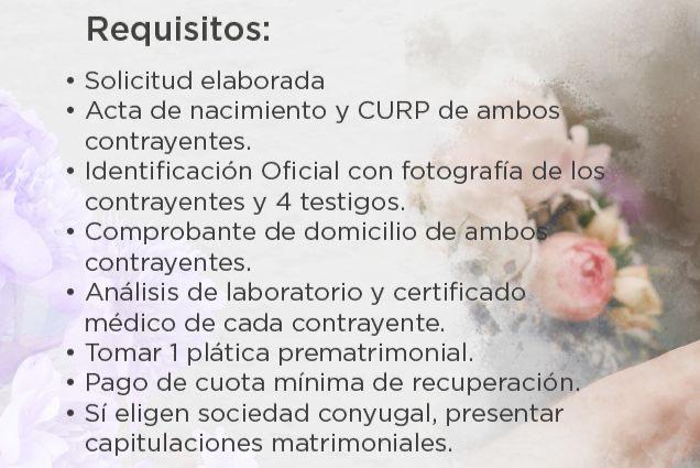 Uno de los requisitos que se establecen es que las parejas deberán tomar una plática prematrimonial, la fecha y hora será asignada por el Registro Civil; además que deberán realizar el pago de cuota mínima de recuperación.
