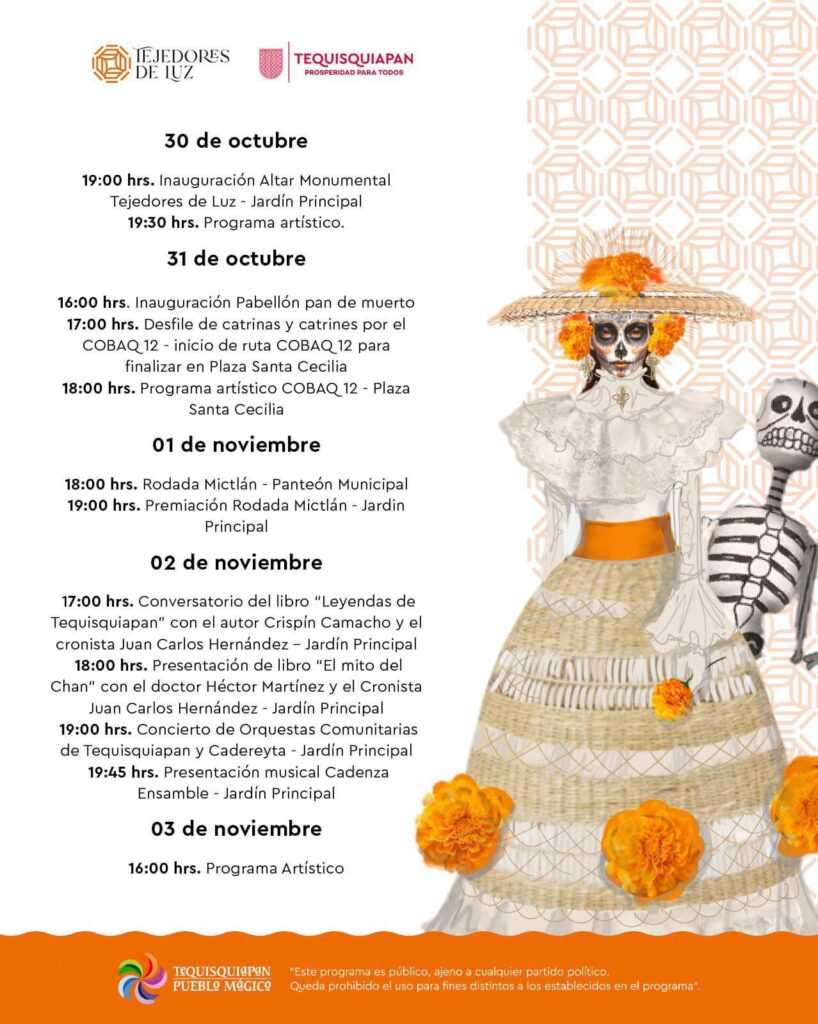 El Municipio de Tequisquiapan a través de la Dirección de Cultura, invita al pueblo en general al Festival «Tejedores de Luz», una celebración en honor al Día de Muertos, con la colocación de un altar Monumental, más de 10 altares distribuidos en diferentes puntos del Jardín Principal y Jardín del Arte, desfile de catrinas y catrines y un pabellón de Pan de muerto.