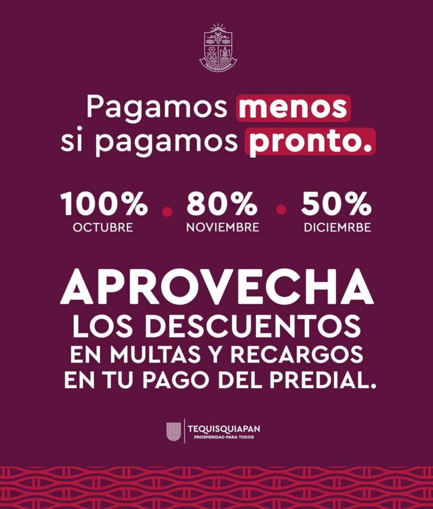 En Tequisquiapan creemos que con la contribución de nuestro pueblo, lograremos tener prosperidad para todas las familias. Es por eso que se dio a conocer un esquema de descuentos para quienes presenten multas y recargos en el pago del predial, en aras de fomentar el pago puntual en beneficio de todas y todos.