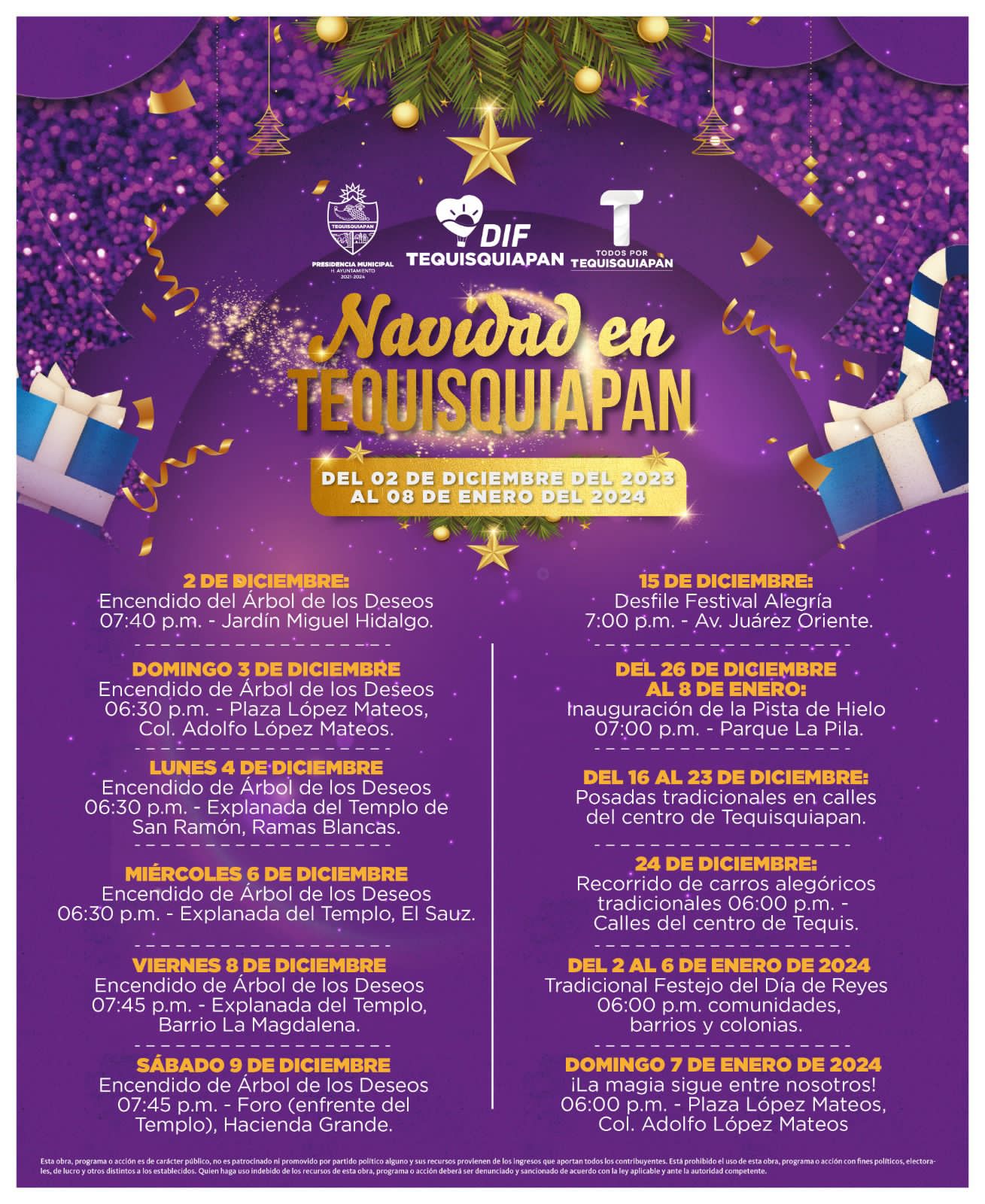 Finalmente, y no menos importante, del 2 al 6 de enero se tendrá el Festejo por el Día de Reyes en comunidades, barrios y colonias y del municipio hasta donde se llevará la tradicional Rosca de Reyes y habrá sorpresas para las niñas y niños.