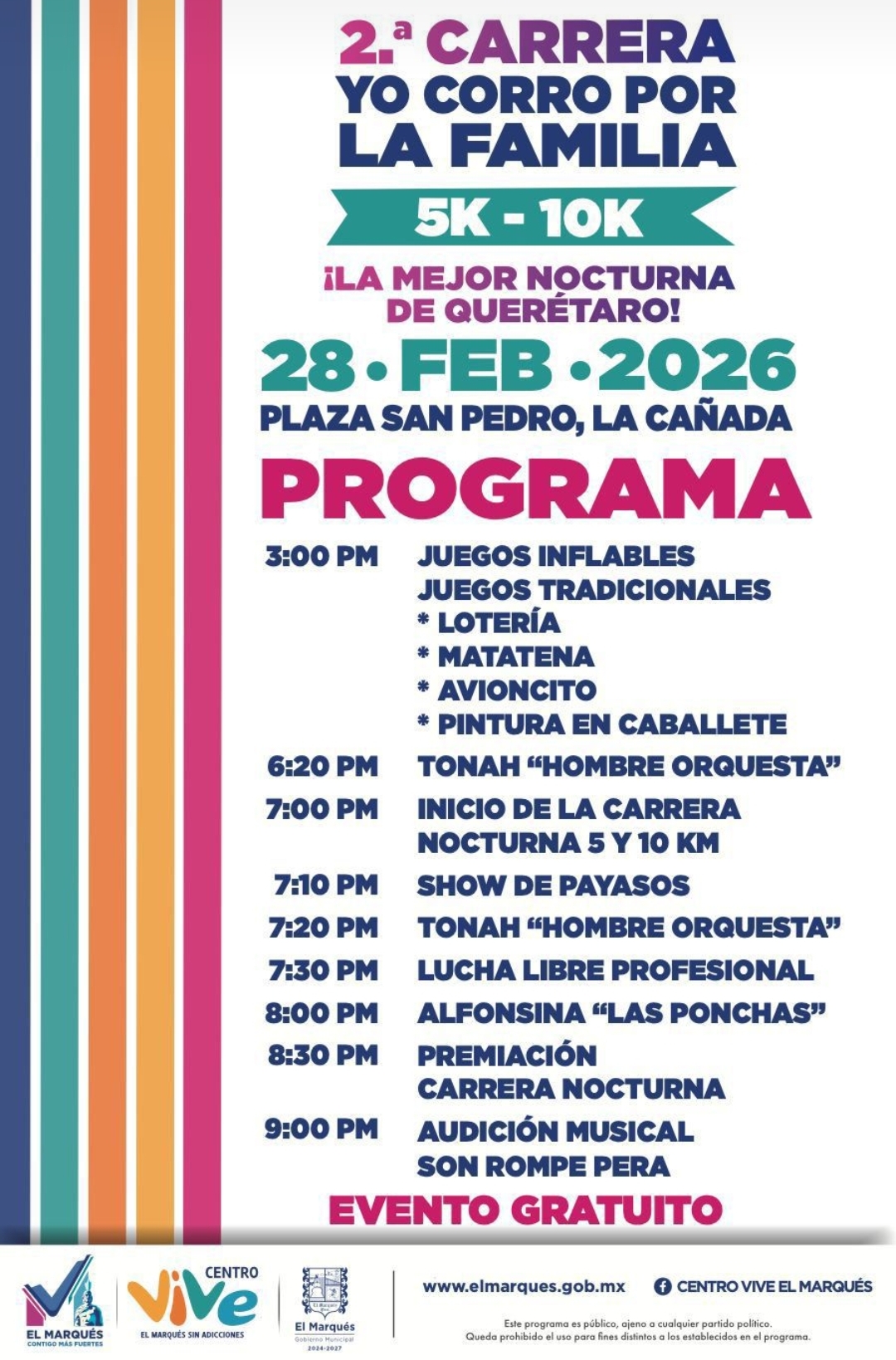 Con rutas y actividades definidas, así como operativos listos, este sábado 28 de febrero el municipio de El Marqués, mediante el Instituto Municipal para la Prevención y Atención de Conductas de Riesgo, Centro Vive, realizará en La Cañada la 2.ª Carrera Yo Corro por la Familia, evento que incluirá diversas actividades orientadas a fortalecer la activación física y la convivencia familiar.