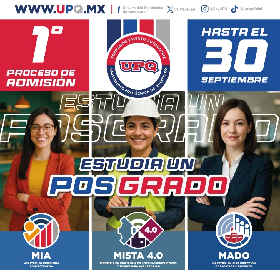 Desde la UPQ se impulsan opciones de formación que permitan a egresados y profesionistas externos desarrollarse en entornos de alta competitividad. La oferta de posgrados responde a los retos actuales de la industria y las organizaciones. Las personas interesadas podrán consultar los requisitos y detalles del proceso en www.upq.mx.
