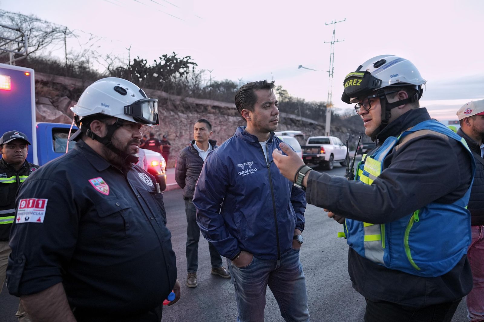 - El presidente municipal de Querétaro, Felifer Macías, acompañado por el director de la Coordinación Municipal de Protección Civil, Francisco Ramírez Santana, visitó el puesto de mando instalado para la atención y contención del incendio suscitado en el punto colindante entre los municipios de Querétaro, El Marqués y Huimilpan.
